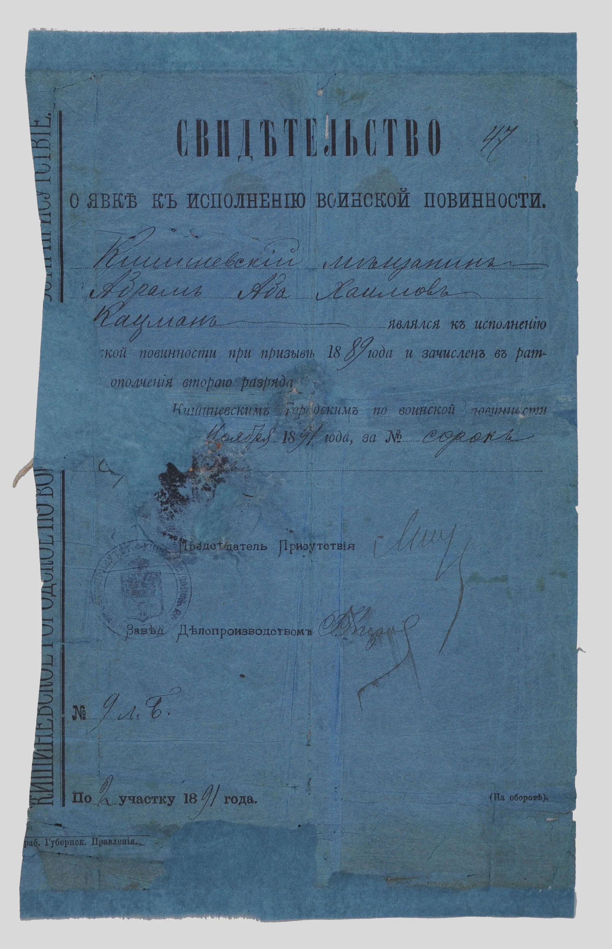 Identification Document, 10-1/2 x 7-1/4”, 1889 document with severe paper loss