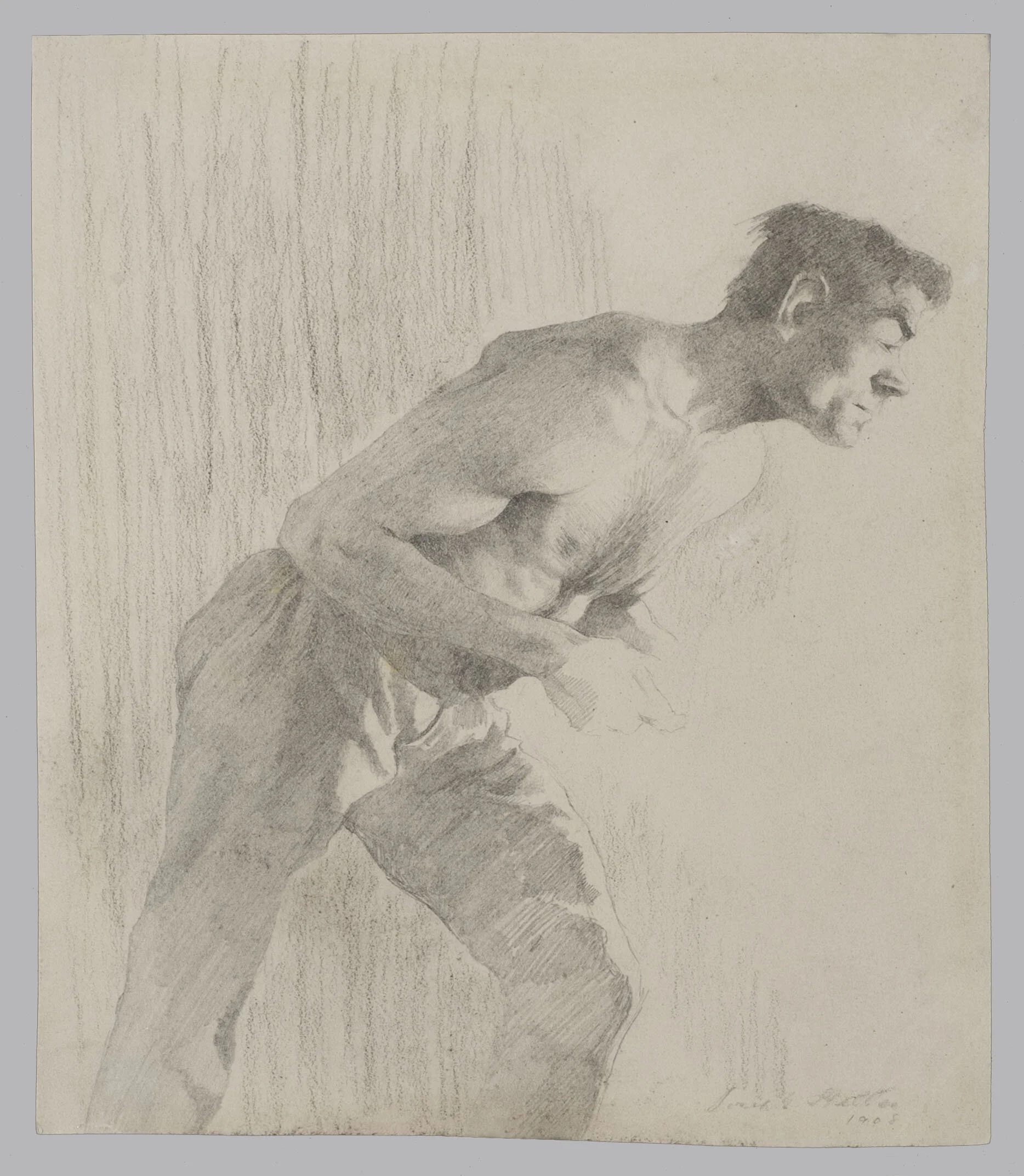 Joseph E. Stella, The Stoker, 8-3/4 x 7-5/8”, graphite drawing with severe discoloration over the image